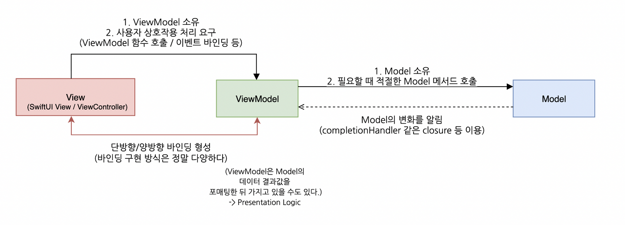 - ViewModel은 View와 Model 사이의 중개자 역할을 하며, Presentation Logic을 처리하는 역할